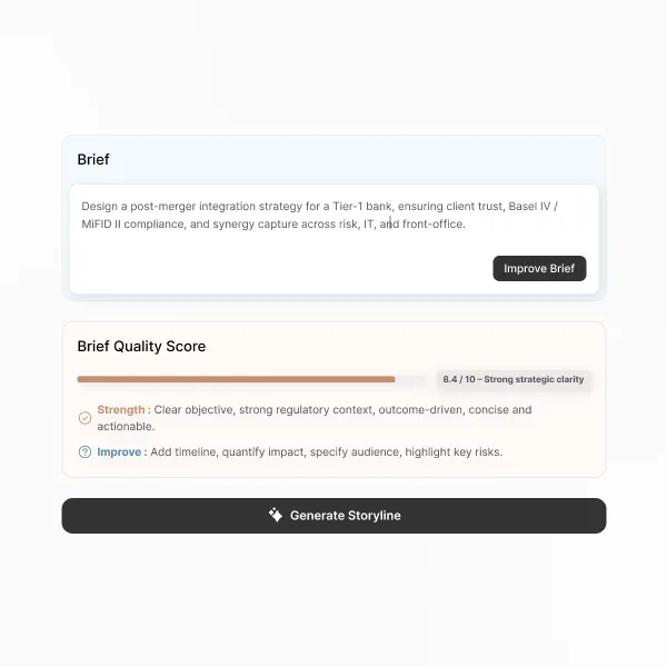 While cigno handles the heavy lifting and constructively challenges your thinking, it continuously captures your insights and ensures full control over deliverables and narrative direction.
