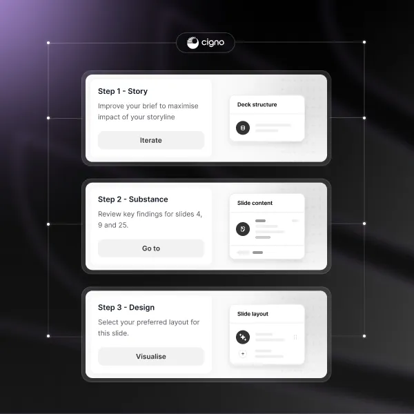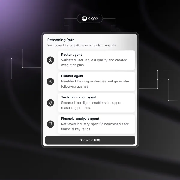 We envision a future where AI becomes a trusted partner in consulting — one that amplifies expertise rather than replaces it. In this future, consultants spend less time on repetitive tasks and more time on strategic thinking, problem solving, and meaningful client impact. CignoAI strives to be at the center of this transformation, setting a new standard for responsible, transparent, and human-centric AI in professional services.